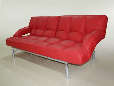 Спинка дивана разделена на две части, которые фиксируются в пяти положениях. В основе дивана находится металлический каркас, матрац из латекса с полиуретаном, модель обладает функцией подъема и опускания подлокотников при раскладывании.